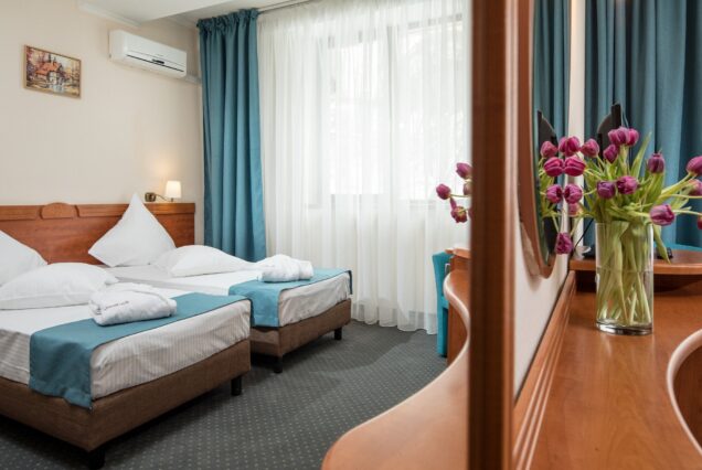 The 4-star Rozmarin Hotel in Predeal is located on DN1 at the exit of the resort, 900 meters from the train station and about 2 km from the Clabucet Slope. The hotel's panorama is spectacular, offering tourists a superb view of the Bucegi Mountains. The hotel's restaurant, with a capacity of 220 people, structured on 2 floors, offers tourists delicious dishes from both Romanian and international cuisine, in an authentic traditional atmosphere. The impeccable services and accommodation conditions that this hotel offers are perfect when you want to spend a relaxing vacation in the mountain area. Thanks to the conditions and multiple facilities, the Rozmarin Hotel becomes an ideal choice for any tourist who is looking for peace and relaxation.